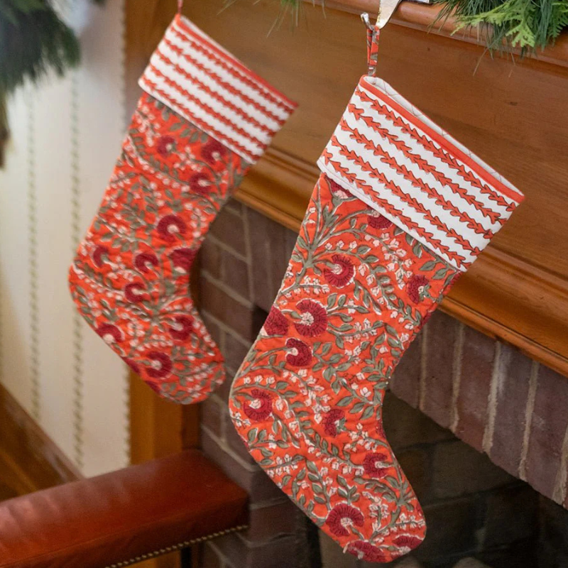 Add a touch of winter charm to your mantel with our Cactus Flower Stocking in Cinnabar. Featuring a rich, warm red inspired by desert clay, this festive quilted stocking is adorned with delicately embroidered cactus blooms in soft pinks, creams, and muted greens.