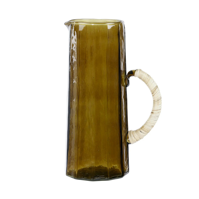 This hammered glass pitcher features a beautifully textured surface and a rattan-wrapped handle for a natural, tactile finish. Both stylish and practical, it’s perfect for serving water, juices, or cocktails at any table.